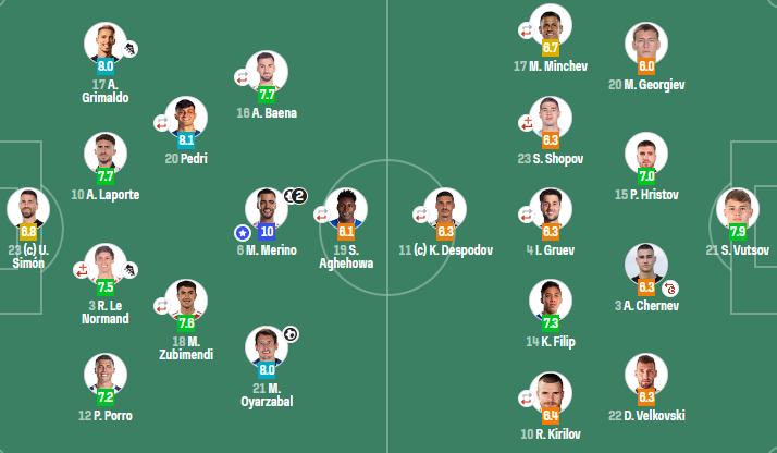 西班牙(4-3-3):乌奈-西蒙;波罗,勒诺尔芒(71'比维安),拉波尔特,格里马尔多;梅里诺,苏维门迪(63'阿莱克斯-加西亚),佩德里(68'巴里奥斯);奥亚萨瓦尔,奥莫罗迪翁(46'博尔哈-伊格莱西亚斯),巴埃纳(63'耶雷米-皮诺)