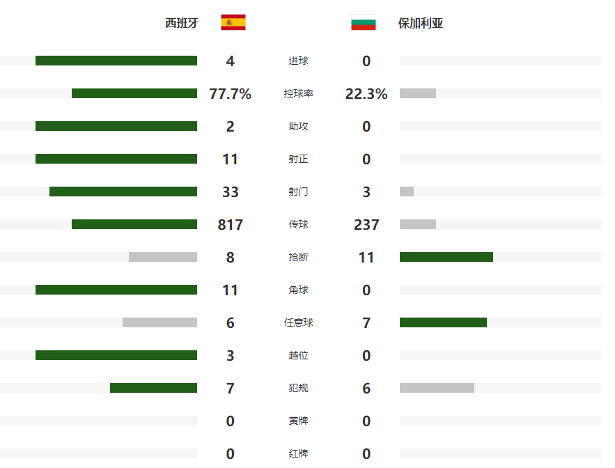 北京时间10月15日凌晨,世预赛欧洲区小组赛E组第4轮中,西班牙主场4-0大胜保加利亚,四连胜领跑小组积分榜。梅里诺梅开二度,近4场国家队赛事打入6球,切尔内夫自摆乌龙,奥亚萨瓦尔补时罚中点球。